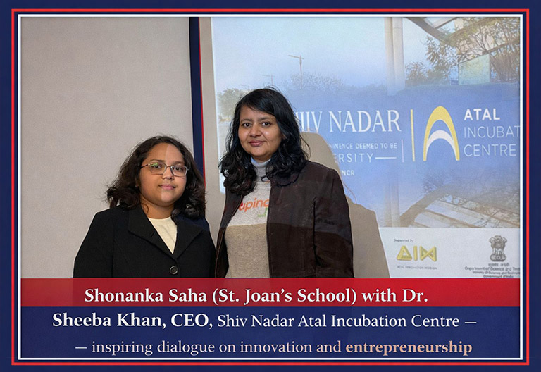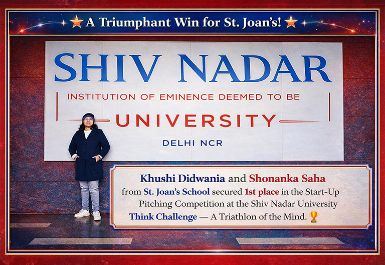 Amidst an inspiring line-up of young innovators, Khushi Didwania and Shonanka Saha of Class XI (Commerce) from St. Joan’s School secured 1st place in the Start-Up Pitching Competition at the Shiv Nadar University Think Challenge – A Triathlon of the Mind.